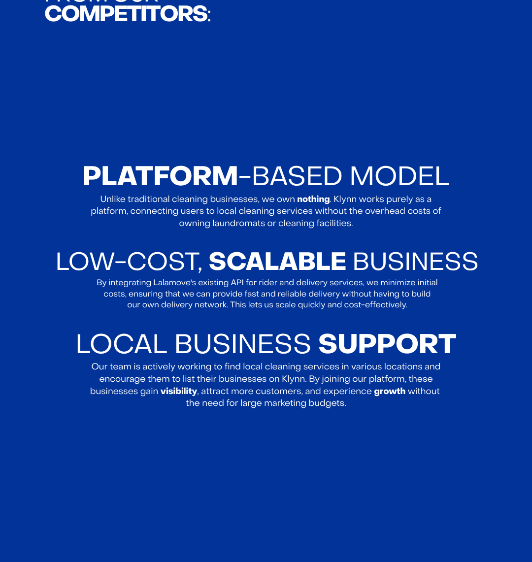Klynn operates without owning laundromats or cleaning facilities, leveraging existing delivery services like Lalamove for cost-effective and efficient operations. By promoting local businesses, Klynn helps them gain visibility and attract more customers, while providing users with a reliable and convenient way to manage all their cleaning needs.